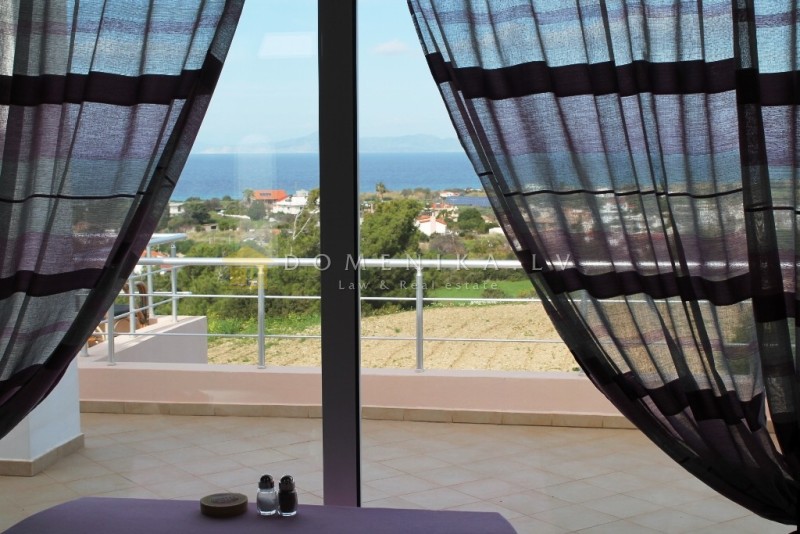 Имеет вид на море, на горы, на лес, также есть мебель, солнечные батареи для нагрева воды, камин, кондиционер, парковочное место, сад, газон, барбекю, отопление, подсобное помещение.